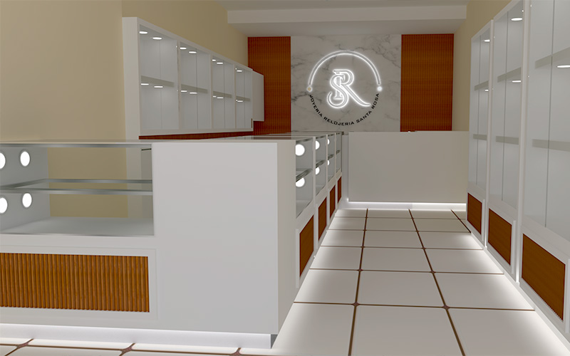Distribución de elementos básicos de mobiliario, escaparates y puntos iluminación. Espacios para la circulación de clientes y acotamineto medidas.